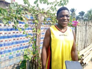 Jonas Zomelo construit des murs avec des bouteilles en plastique. Crédit Photo : DR